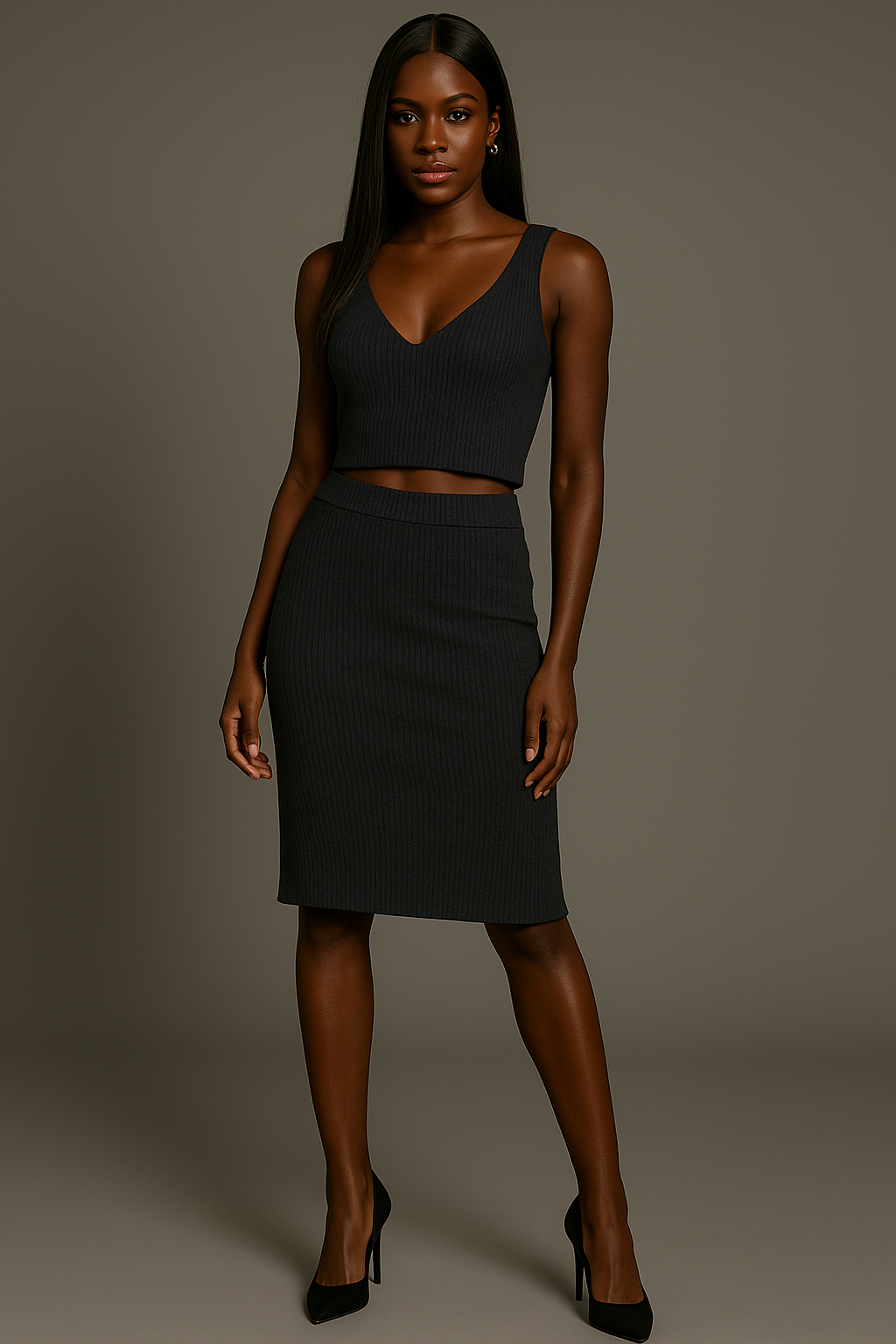 Este conjunto é confeccionado em tecido canelado, conhecido pela elasticidade e textura diferenciada. O top possui decote em V e alças largas que proporcionam estabilidade e conforto. A saia na altura do joelho tem corte reto, oferecendo um caimento elegante e ajustado ao corpo, ideal para valorizar a silhueta.