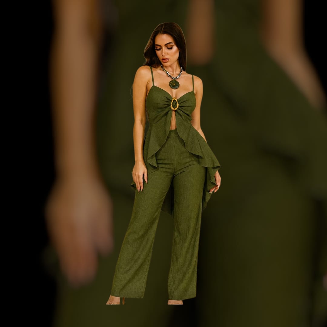 Deslumbre-se com este conjunto verde musgo — uma peça versátil, moderna e cheia de estilo! O modelo conta com um top de alças finas e laço frontal, que valoriza o busto e traz um toque de sensualidade na medida certa. O detalhe da argola dourada central adiciona sofisticação e charme, enquanto os babadinhos assimétricos criam um caimento leve e elegante sobre o quadril.